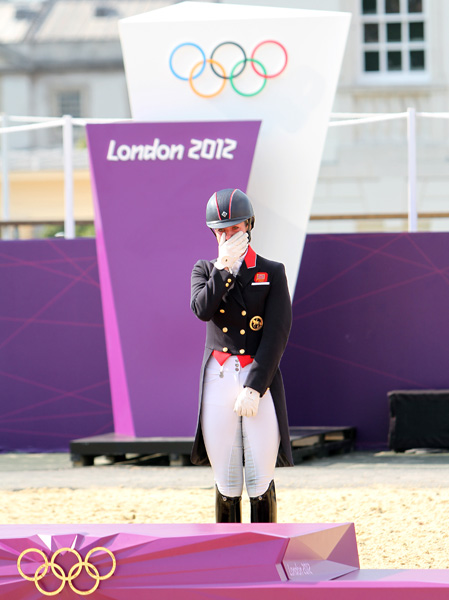 - Charlotte Dujardin on Valegro celebrating their Olympic individual gold medal after capturing team gold, the first rider and horse to achieve the Olympic double gold since Isabell Werth and Gigolo in 1996. © 2012 Ken Braddick/dressage-news.com