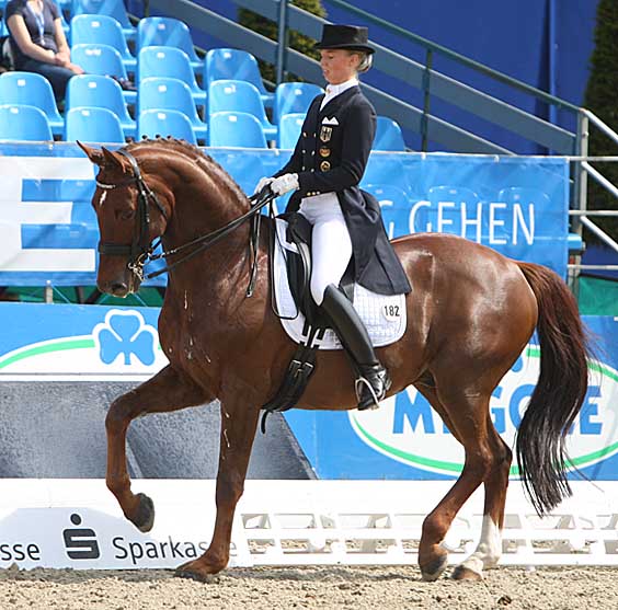 LINGEN, Germany, July 13–Maria Anita Andersen of Denmark rode Loxana to victory Saturday nght in the CDI4* Grand Prix Freestyle, the first international musical ride for the pair that began their Big Tour career at this same show a year ago.
