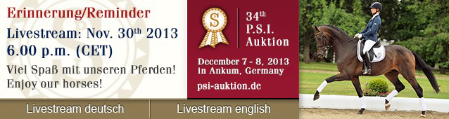 ANKUM, Germany, Nov. 28, 2013–The Performance Sales International dressage horse collection will be shown live the Internet on Saturday, Nov. 30 at 6 p.m. CET (0500GMT/12 noon US ET) as a preview for the auction scheduled for Ankum Dec. 7-8.