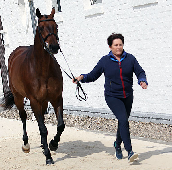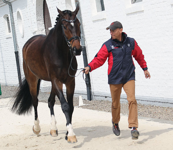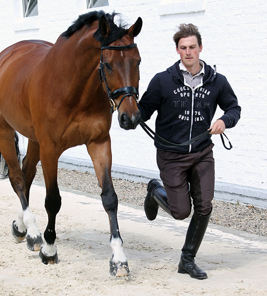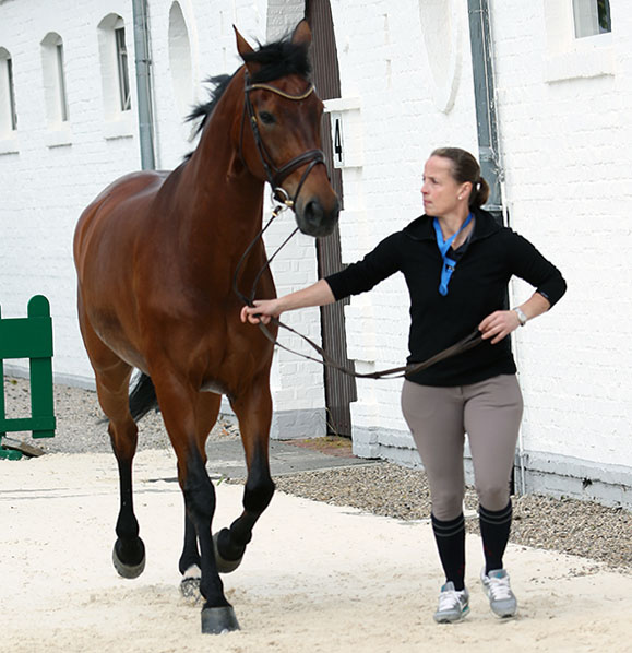 Isabell Werth telling Don Johnson to behave in the veterinary inspection for the World Equestrian Festival CDI5* at Aachen. © 2015 Ken Braddick/dressage-news.com