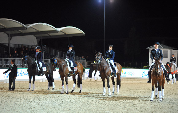 The competition was a nail-biter, going down to the last Japanese combination of Masanao Takahashi on Fabriano who needed a score of 68.600 per cent to pull even with South Africa. The pair scored 68.660 per cent and the total of the three best scores was 200.58, 0.06 ahead of South Africa on 200.52. Kazakhstan finished on 192.96 at the special event that was the last to qualify a team directly to the Olympics.