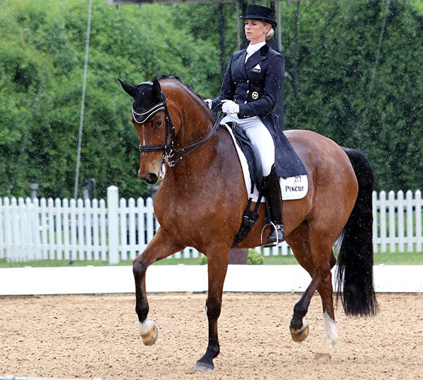 Daniel Bachmann-Andersen riding Hotline, a 12-year-old Hanoverian stallion, in their first CDI scored 73.353 per cent for second place. The pair placed third in the Grand Prix Saturday.