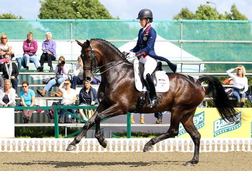 HICKSTEAD, England, July 27, 2017–Charlotte Dujardin, competing Hawtins Delicato in preparing the nine-year-old gelding as a future British team mount for Carl Hester, won the CDI2* Prix St. Georges Thursday for the third victory since the beginning of the horse’s international career this month.