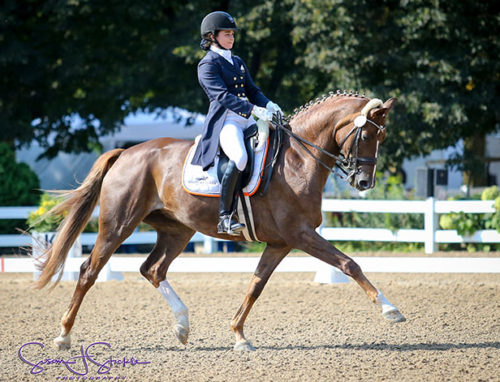 WAYNE, Illinois, Aug. 26, 2017–Quintess, a Hanoverian mare, and Darius, a Hanoverian gelding, tied for the United States five-year-old championship Saturday, while Anna Stvall on Frankie won the Developing Prix St. Georges title.