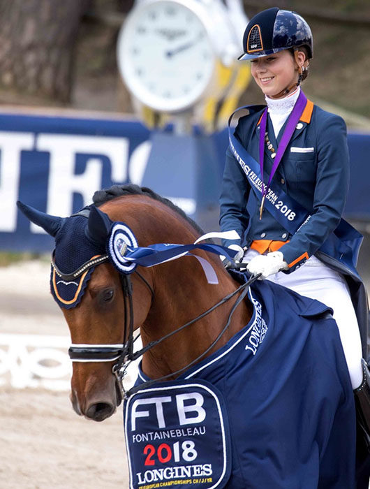 FONTAINEBLEAU, France, July 14, 2018–Dutch Junior Daphne van Peperstraten rode Greenpoint’s Cupido to victory in the Freestyle Sunday to claim the pair’s third gold medal in a sweep of the European Championships while compatriot Esmee Donkers on Chaina took the Young Rider Freestyle for their second gold