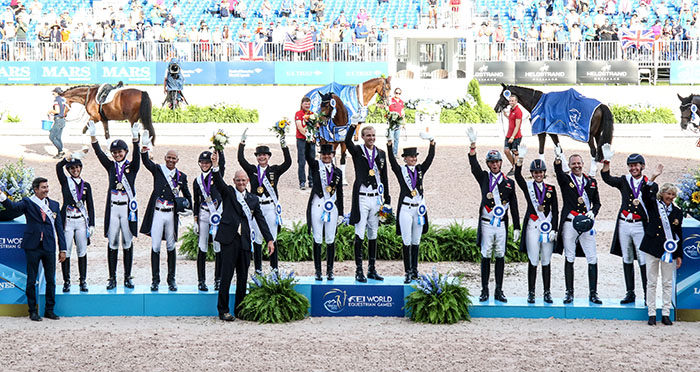 TRYON, North Carolina, Sept. 13, 2018–Germany captured the World Equestrian Games dressage team gold medal Thursday and the United States took silver over Great Britain for bronze in probably the most dramatic nail-biting world championship with final placings decided by the last ride after two days of competition.