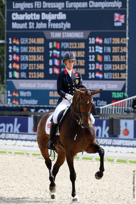 ROTTERDAM, Netherlands, Aug. 21, 2019–Charlotte Dujardin rode Mount St. John Freestyle to what would have been an incredible European Championships second place finish individually and silver medal for Great Britain’s team but for…