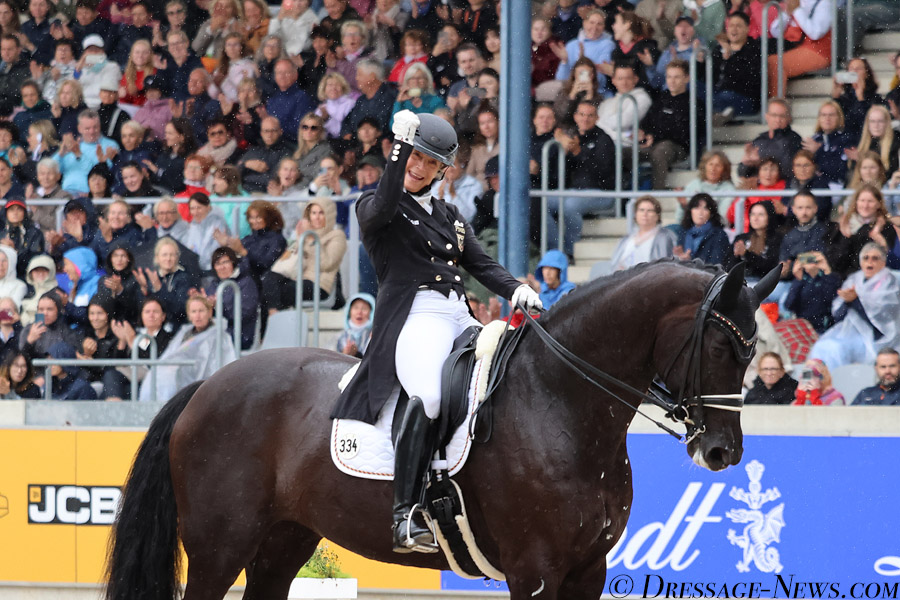 Isabell Werth pumping her fist after riding Wendy de Fontaine in Aachen’s CDIO5* Grand Prix Freestyle. © 2025 Ken Braddick/DRESSAGE-NEWS.com