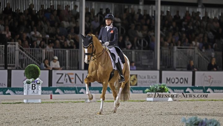 WELLINGTON, Florida, Jan. 23, 2026–Susan Pape rode her “spicy” Harmony’s Giulilanta to victory in the Global Dressage Festival Freestyle Friday night under lights a day after capturing the Grand Prix to mark the British rider’s first ever top rated CDI5* wins.