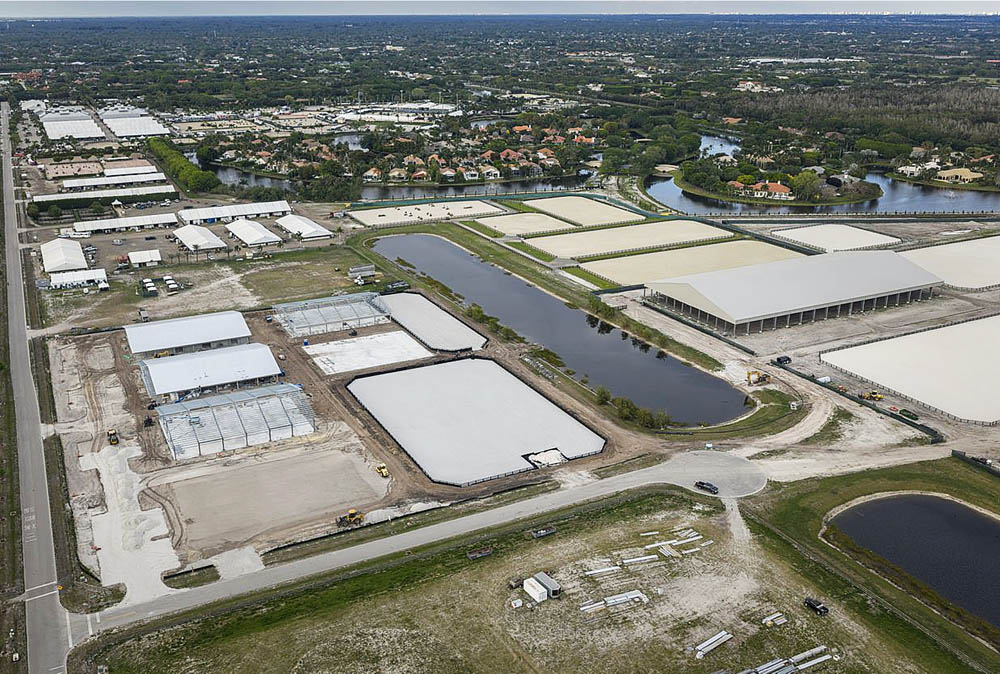 An aerial photo of the expanded area of Wellington International shows four of five proposed barns in varying stages of construction. Alongside the barns are competition arenas in place of the Global facilities that ended 15 years of dressage competition just days ago. To the right is a covered arena that is significantly larger than the existing covered arena at Global.