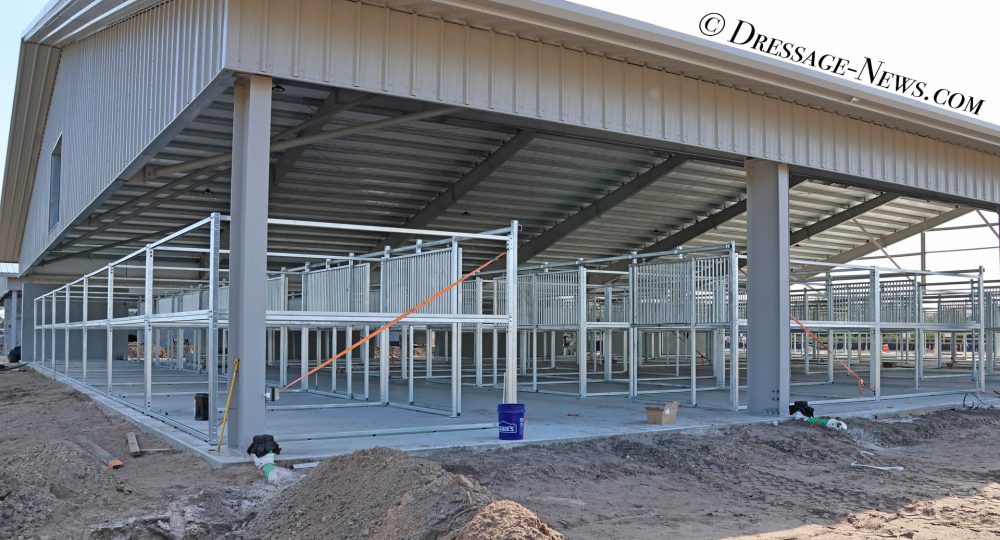 Horse stalls are being installed in the first of the completed barns. Competition arenas already have bases and are being readied for footing surfaces.