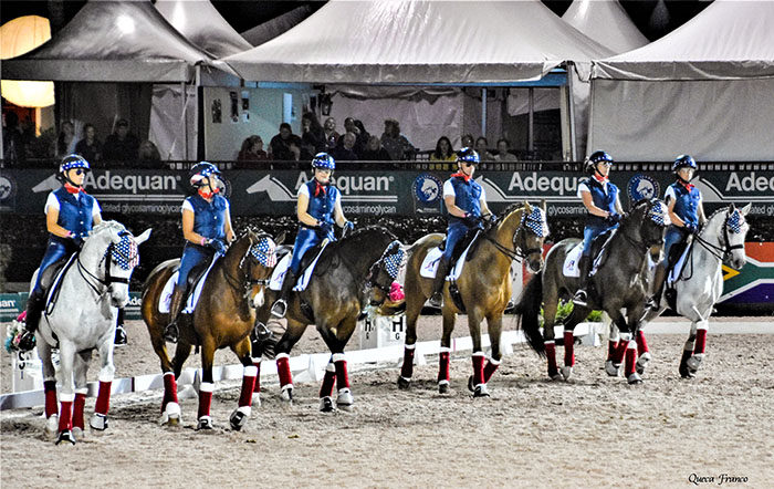WELLINGTON, Florida, Mar. 6, 2020–A boldly “American” team that included two Canadians and an Australian triumphed in a quadrille of Bruce Springsteen hits at the annual Challenge of the Americas fundraising event for breast cancer research at the Global Dressage…