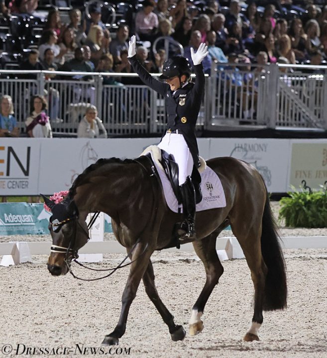 Felicitas Hendricks rode her Drombush to victory in Global Dressage Festival CDI4*Grand Prix Freestyle under lights for 4th straight win in four start in Wellington…